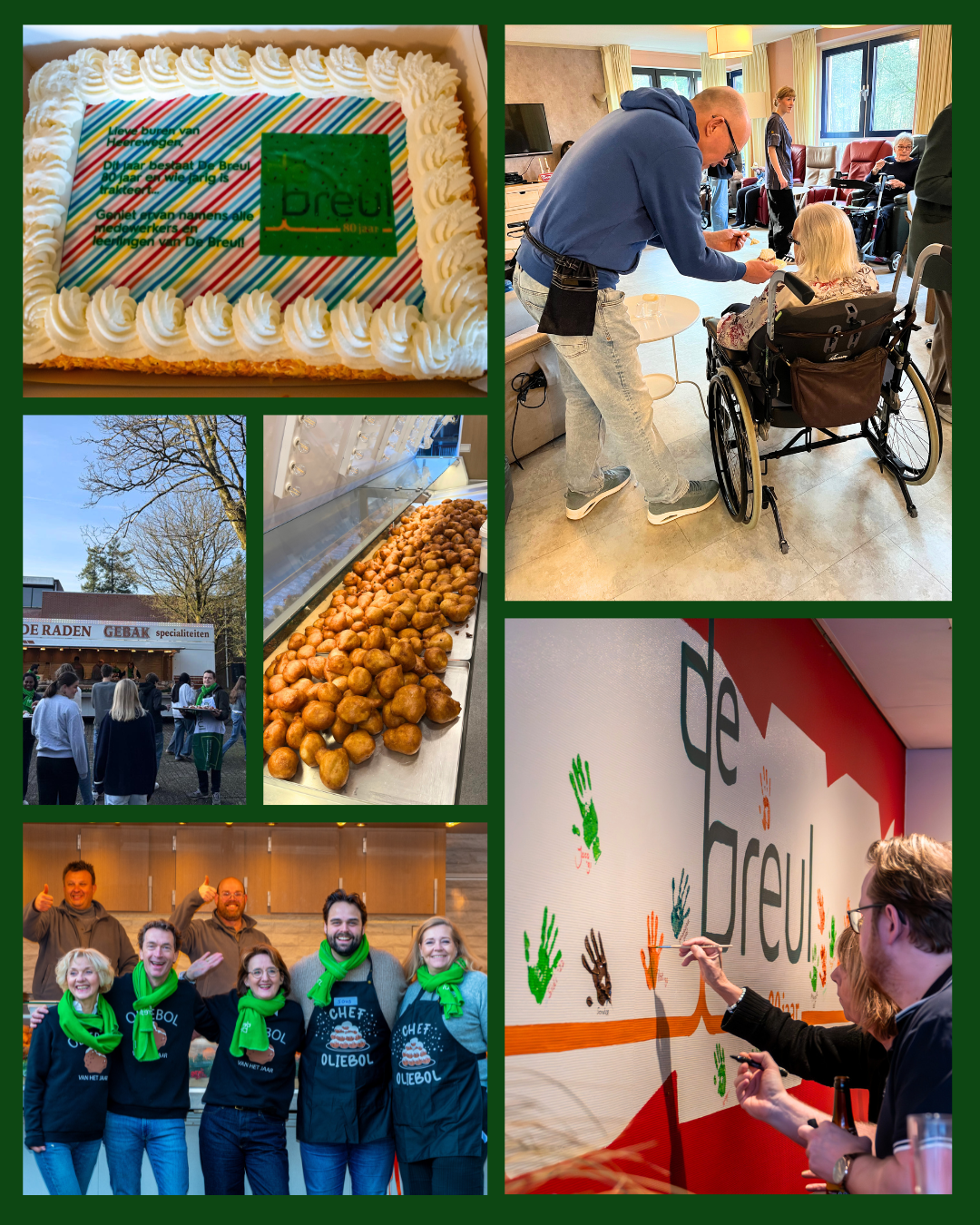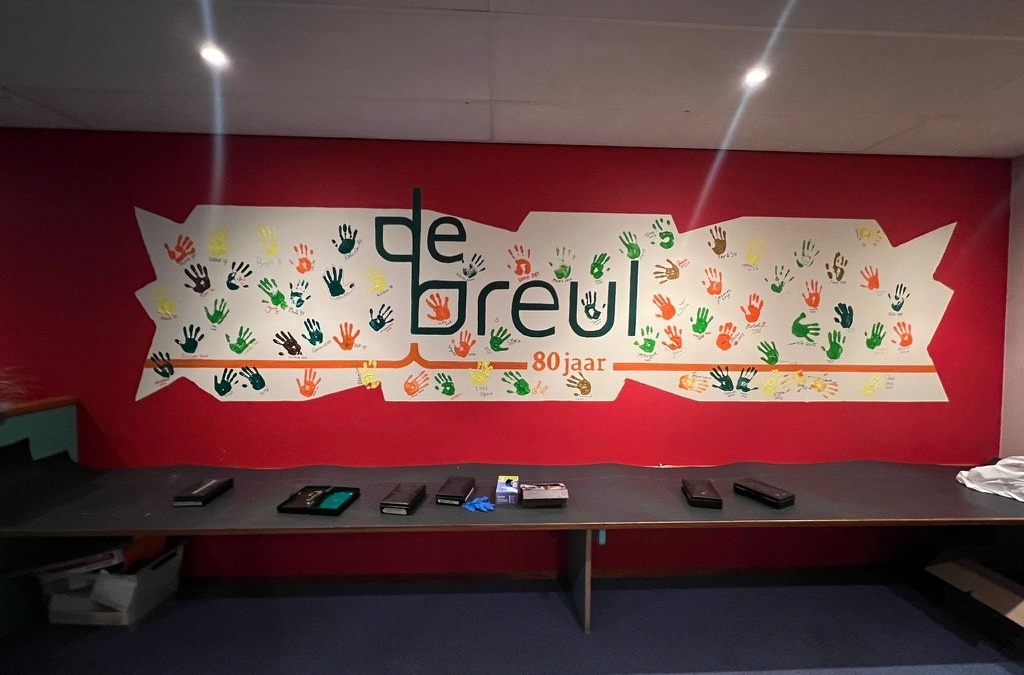 Aan het eind van de middag was het tijd voor een feestelijke (alcoholvrije) borrel voor alle medewerkers. Tijdens deze bijeenkomst werkten we samen aan een bijzonder blijvend aandenken: een prachtig muurkunstwerk met het jubileumlogo van 80 jaar De Breul. Iedere medewerker zette een handafdruk in verf – mét datum van indiensttreding. Het resultaat is prachtig en staat symbool voor de gezamenlijke inzet van iedereen die onze school zo bijzonder maakt.