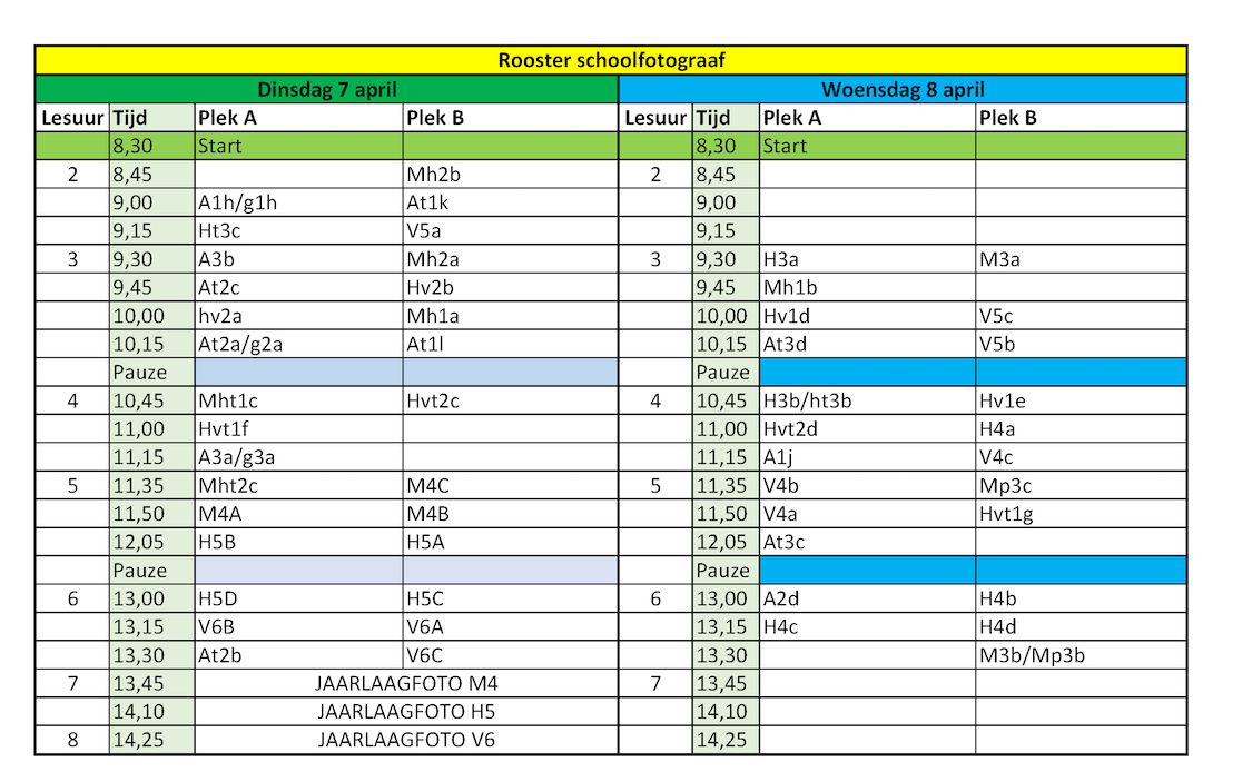 Volgende week is de schoolfotograaf weer op school. De leerlingen zijn via het leerlingportaal geïnformeerd waar en wanneer ze zich met hun klas kunnen melden. U kunt het rooster onderin dit bericht zien.