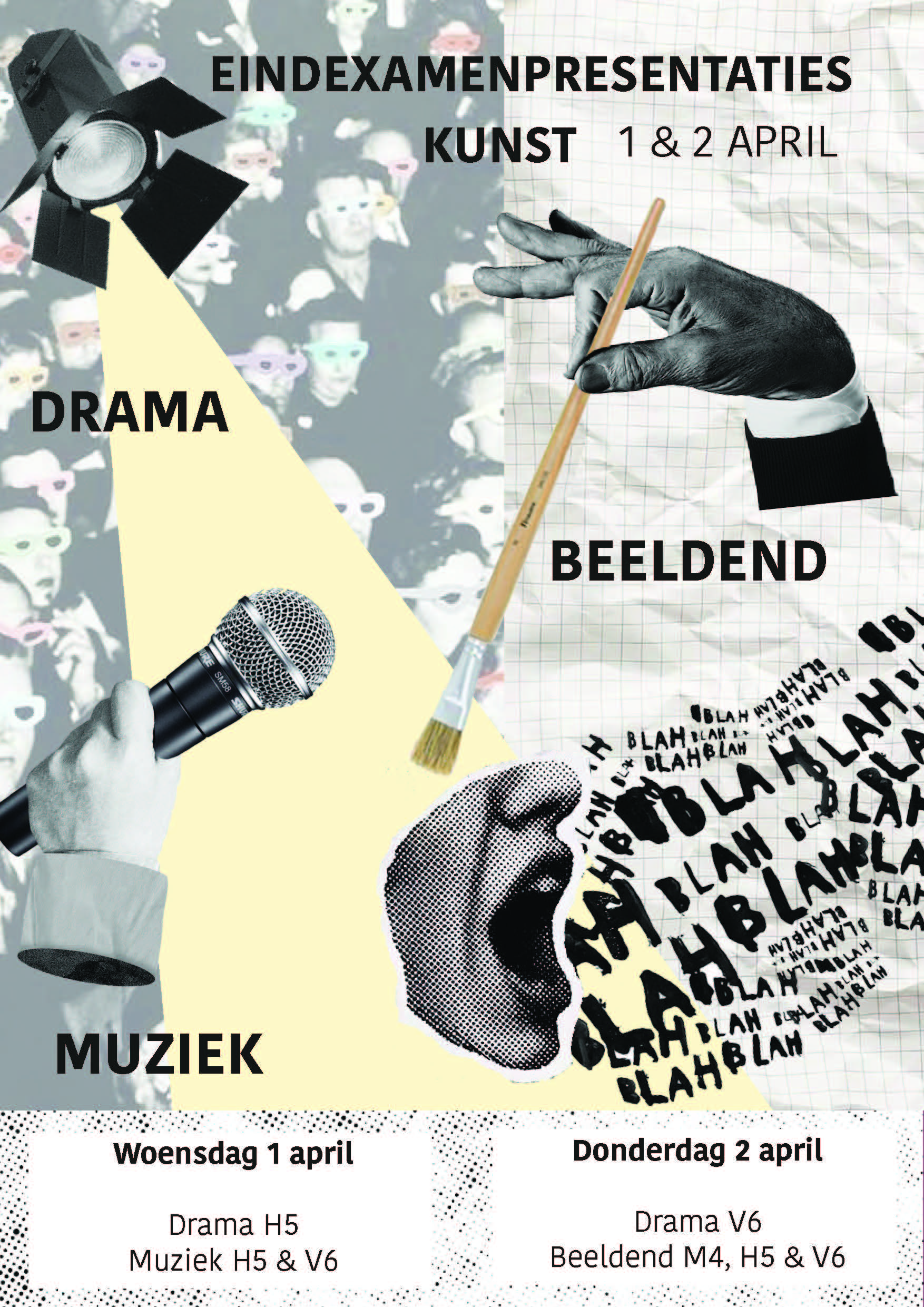 Voor de ruim 100 leerlingen is dit het hoogtepunt van hun examenjaar: het moment waarop alles samenkomt wat zij hebben geleerd, onderzocht en gecreëerd. Het beloven twee inspirerende avonden te worden vol muziek, theater en beeldende kunst, waarin talent, lef en creativiteit centraal staan. Wij nodigen iedereen van harte uit om te komen kijken en samen met ons te genieten van het resultaat van al hun harde werk.